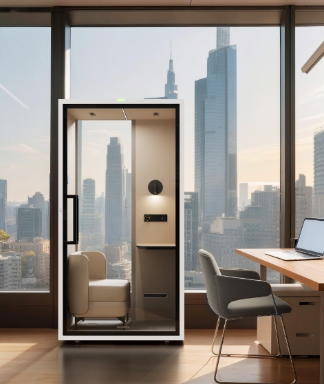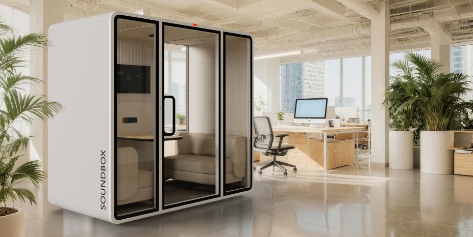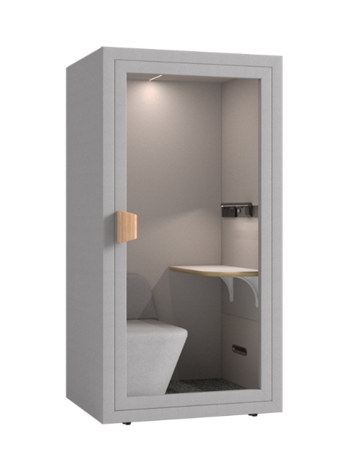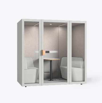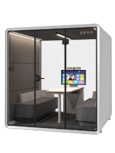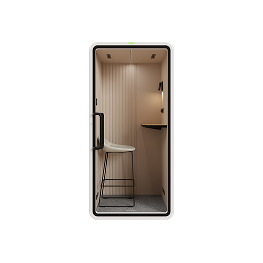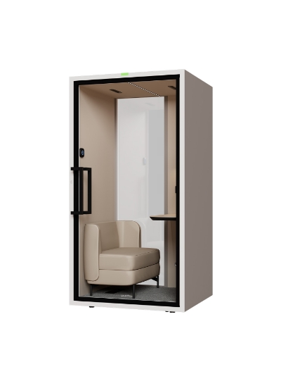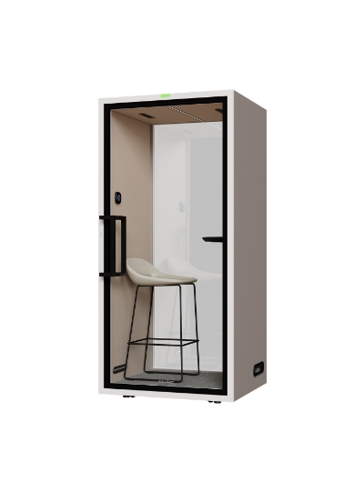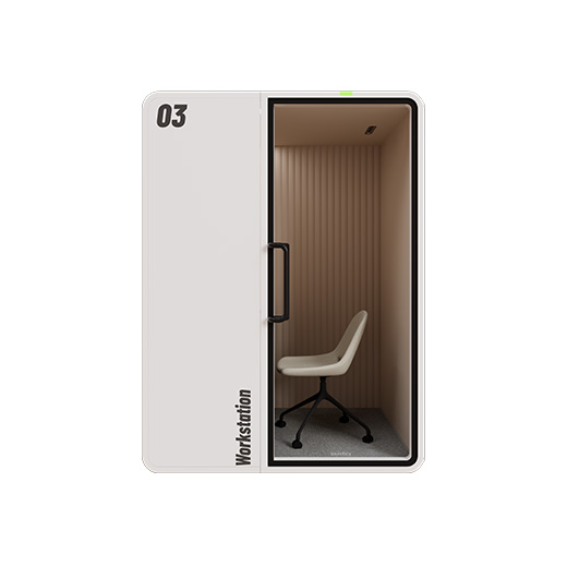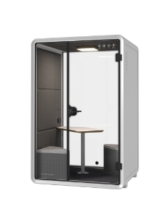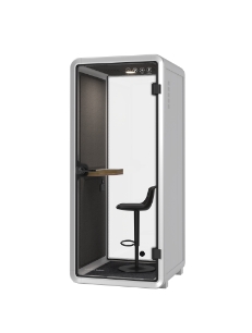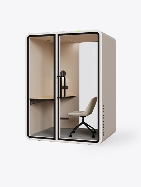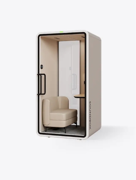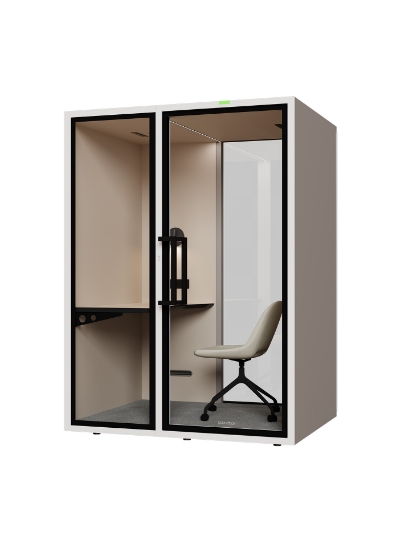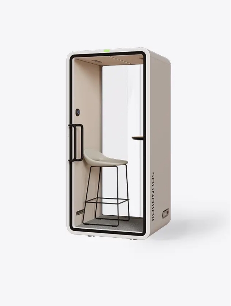 Soundboxの防音ブースは、プロフェッショナル水準の遮音性能(-31.2dB)と、人間工学に基づく機能美を兼ね備えたワークブースです。電源、USBポート、調光照明を備え、設置したその日から快適で機能的な個室オフィス環境を提供します。