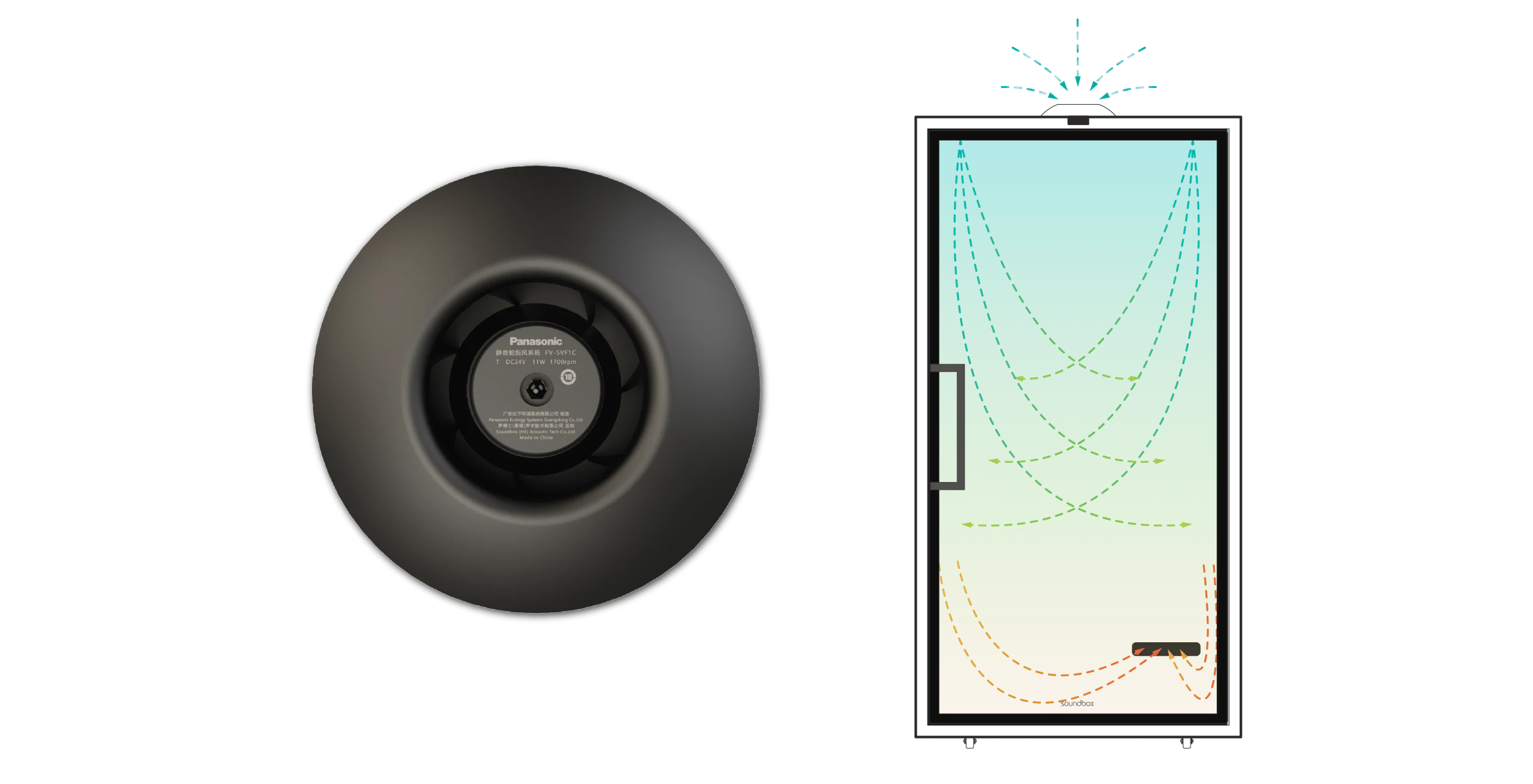 Panasonicは、信頼性の高い換気技術と豊富な実績を持つメーカーです。その技術力に、Soundboxの音響エンジニアたちのノウハウを掛け合わせ、サイレントブース特有の通気抵抗に着目した「低騒音・高静圧換気システム」を共同開発。この新システムは、低回転・高風圧を実現する遠心ファンと、騒音を大幅に抑える迷路型構造ダクトを隠し込んだ設計。