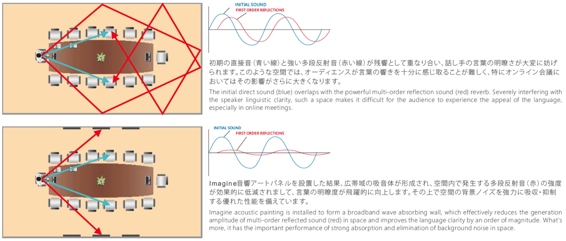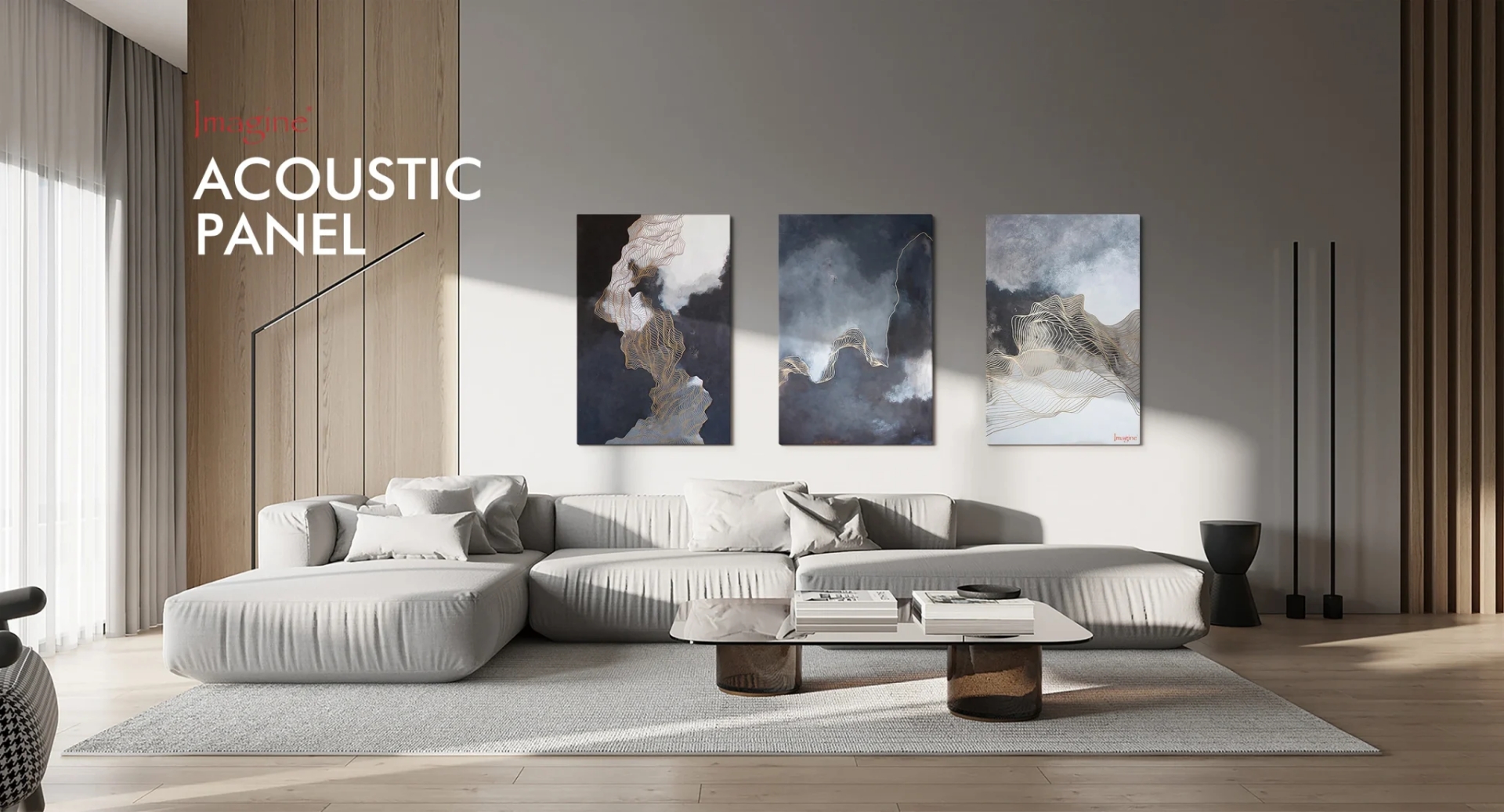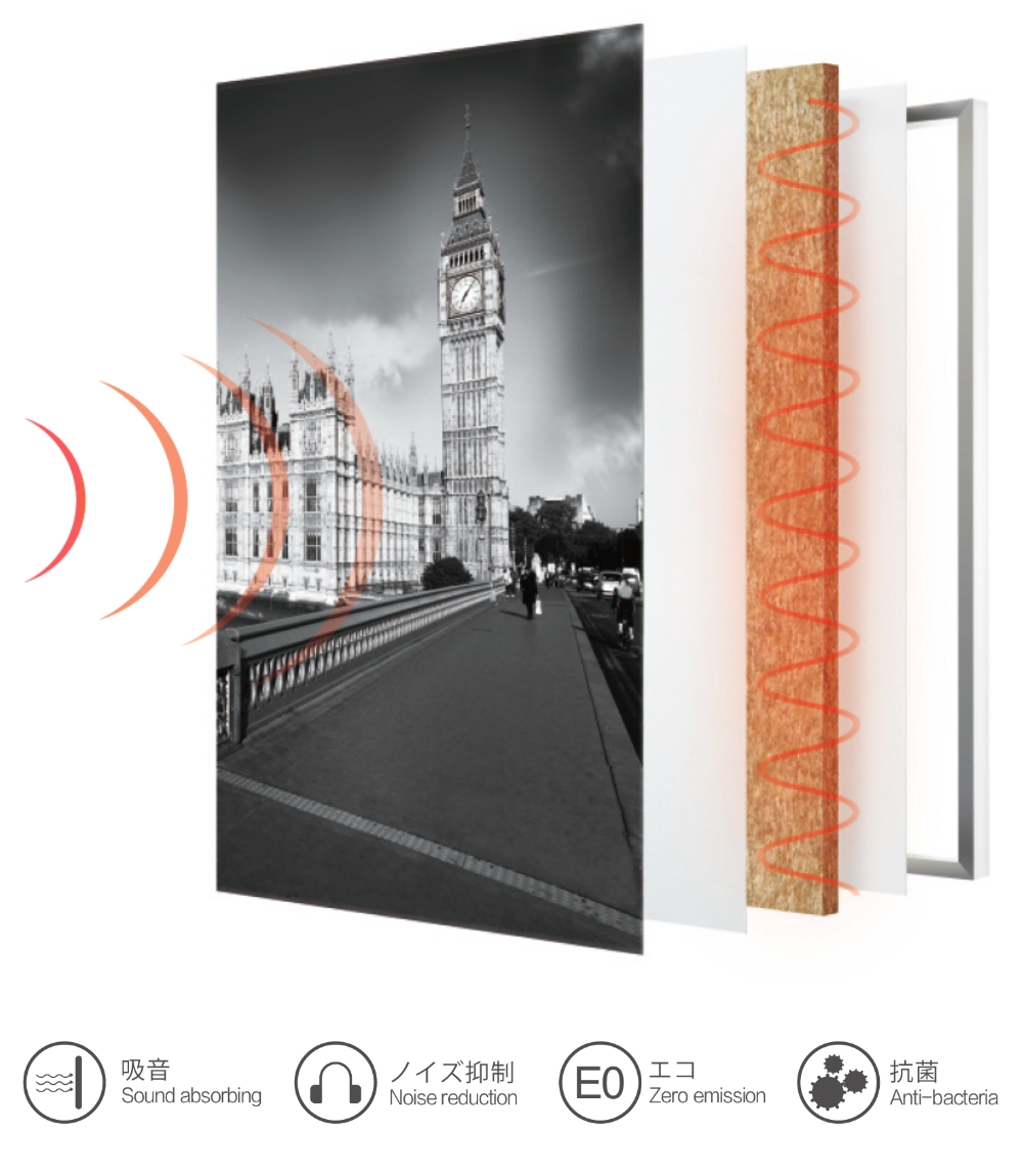 Imagine⾳響アートパネルは、天然植物由来の超極細繊維を原料とし、3%のPETポリエステル繊維を混合し、280度の⾼温で接着剤を使⽤せずに熱圧成形された天然綿⾳響パネルです。