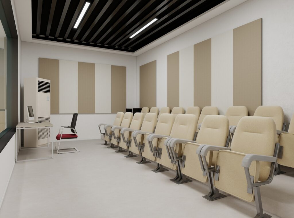 空間からの直接音を効率的に吸収するだけでなく、天井下空間における低周波定在波に対して有利な吸収構造を備えています。