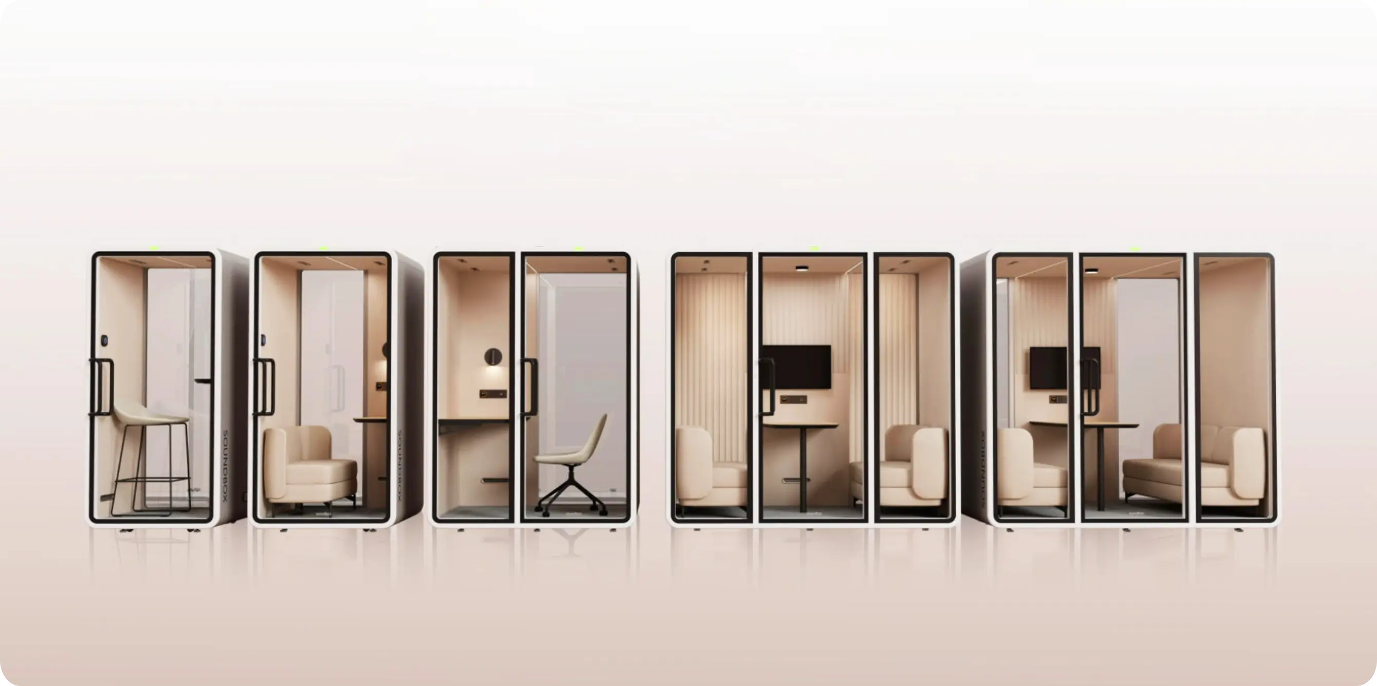 1人用から複数人用のミーティング用途まで、多様なシーンに対応する豊富なラインナップ(Home Pod, ART Pod, SRシリーズ等)。吸音パネルから防音建材まで自社で手がけるからこそ、貴社のニーズに合わせた柔軟なカスタマイズが可能です。